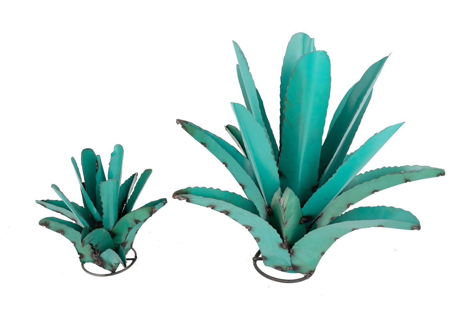 Handmade out of metal and hand painted, each individually the uniqueness and one of a kind of these cute turquoise tone agave cactus is sure to bring warmth to any any home or garden. We offer two sizes.